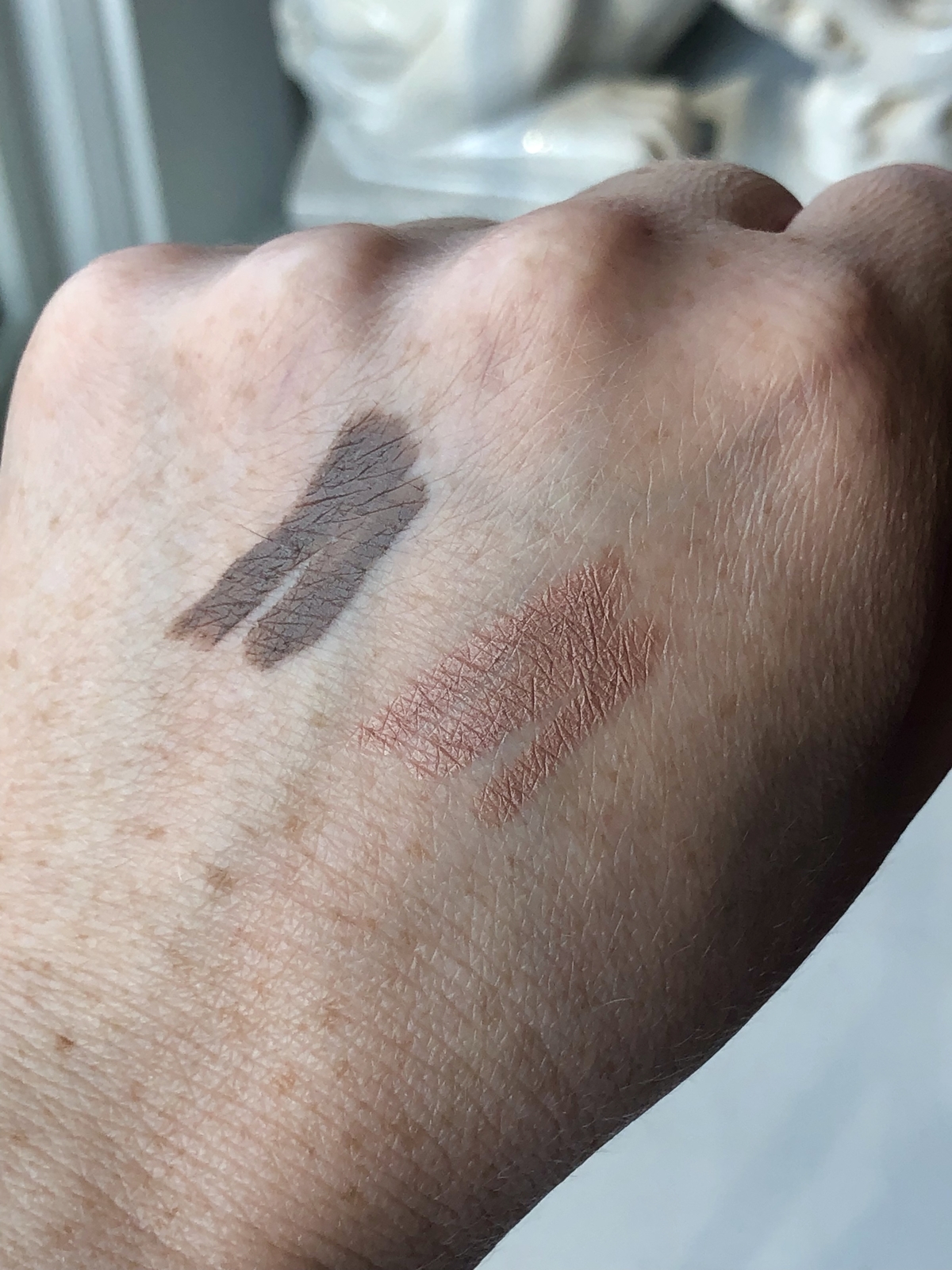- Left: Cobblestone, a matte taupe grey. Right: Au Naturel, a soft satin pale pinky-beige.