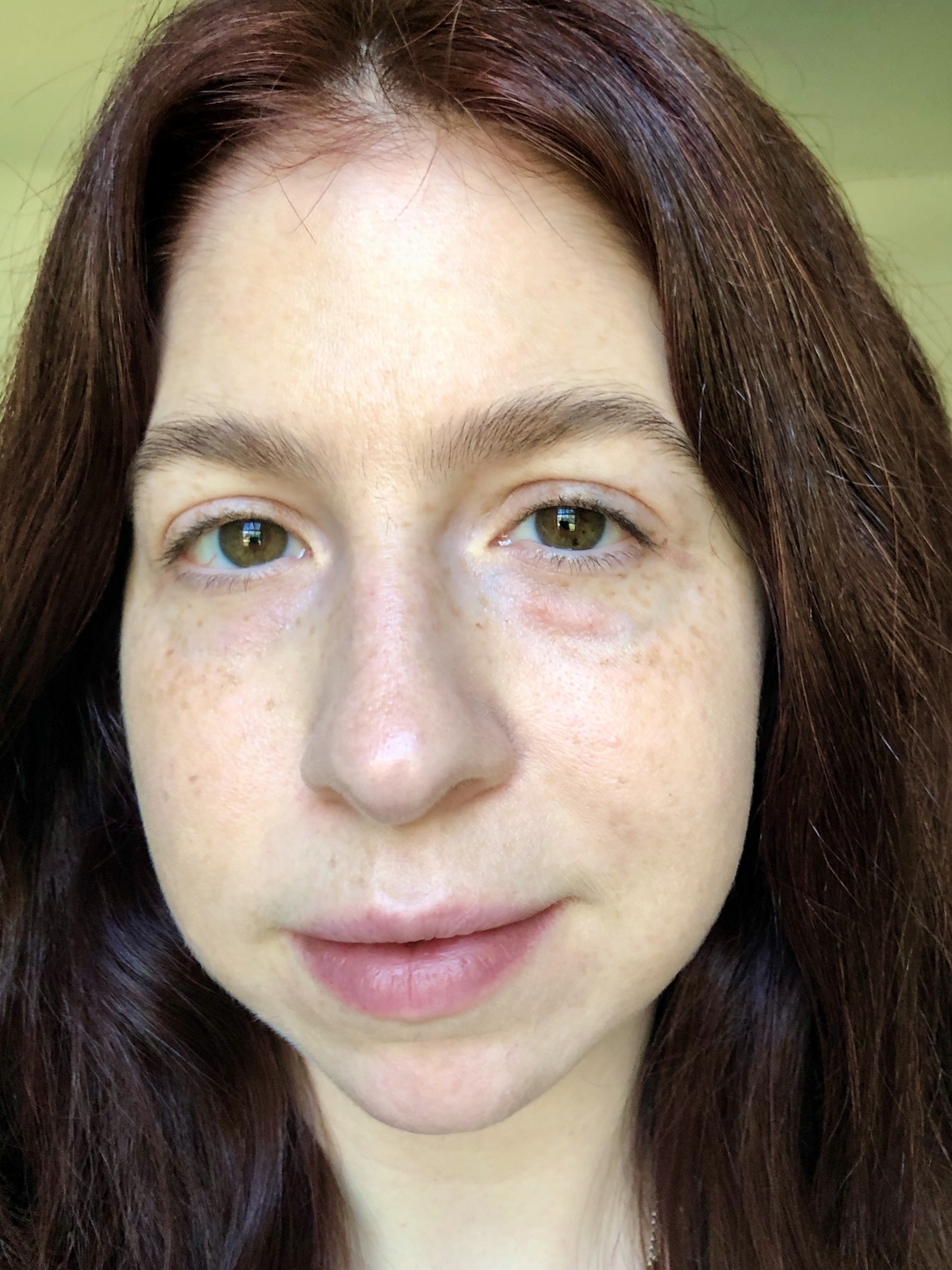 - After application of Merit Beauty Minimalist Perfecting Complexion Stick, and Brow 1980 Volumizing Pomade. No concealer was applied here.